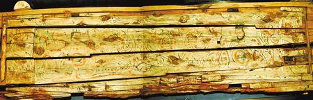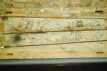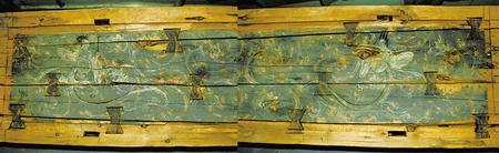 1998年新城魏晉南墓出土。這副完整的木棺由棺身和棺蓋組成,棺蓋內(nèi)側(cè)有一長(zhǎng)方形凹面,內(nèi)彩繪伏羲女?huà)z圖。伏羲女?huà)z人首蛇身,兩尾相交,伏羲在右,左手執(zhí)矩,女?huà)z在左,右手執(zhí)規(guī)。伏羲女?huà)z周圍飾云氣紋。棺身呈長(zhǎng)方體,兩檔頭用墨線勾畫(huà)星象圖,棺內(nèi)側(cè)四壁彩繪幃帳、絹帛、蠶繭等圖形。
