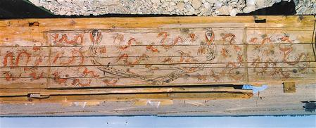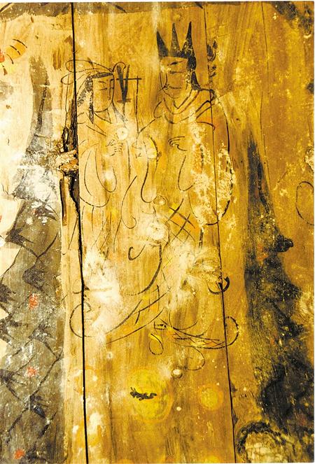 2002年新城毛莊子魏晉墓出土女棺伏羲女?huà)z圖棺板畫(huà)(局部)。