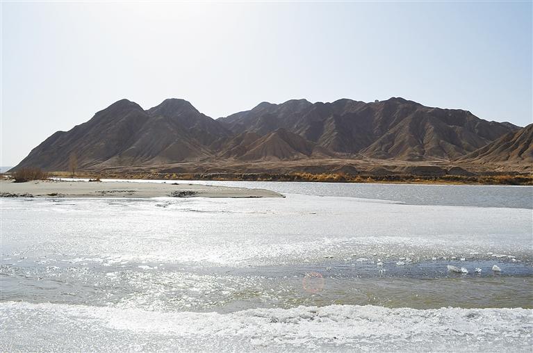 找到離它最近的路段,停下車,我踩著河沙到近處一睹它的容顏。它水量的豐沛超出了我的想像,岸邊是晶瑩剔透的河冰,再往中間便是汩汩流淌的河水了,河面有的地方寬達二三十米,在它兩邊,河水浸潤之下,便滋潤出成串的濕地,有蘆葦茂盛得像是江南水鄉(xiāng)。