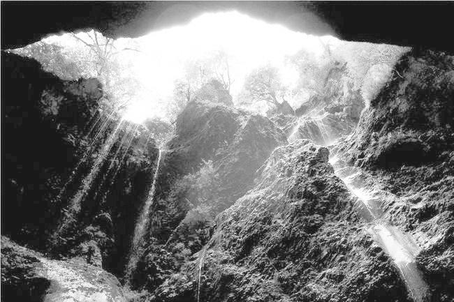 天井峰是整座天井峽的最高點。距天井峰不遠處,有一股噴涌而下的泉水飛流直下,正好激濺在一塊奇石上,日積月累,石上竟沖刻成一個融隸、篆、草為一體的天然“幽”字,這塊巨石也就被稱為“幽”字石,因此天井峽又被稱為“天井幽谷”。