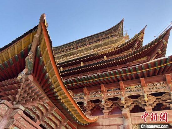 圖為5月上旬,甘肅山丹縣大佛寺內(nèi),正在修繕中的古建筑大雄寶殿。 中新社記者 高展 攝