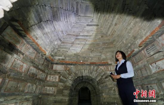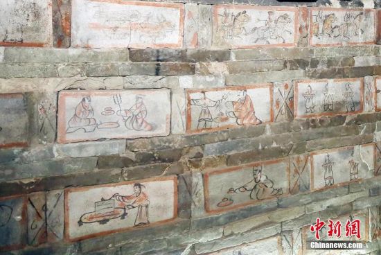 位于甘肅嘉峪關(guān)市的嘉峪關(guān)新城魏晉墓群,內(nèi)有千余座魏晉古墓,從1972年起,先后發(fā)掘18座,其中9座為畫像磚墓。磚壁畫取材于現(xiàn)實(shí)生活,用連環(huán)畫的方式反映出了當(dāng)時河西地區(qū)生活、生產(chǎn)、軍事、文化的真實(shí)情景,具有濃厚的生活氣息。目前只開放的六號墓,其壁畫內(nèi)容豐富,具有很強(qiáng)的代表性。高展 攝