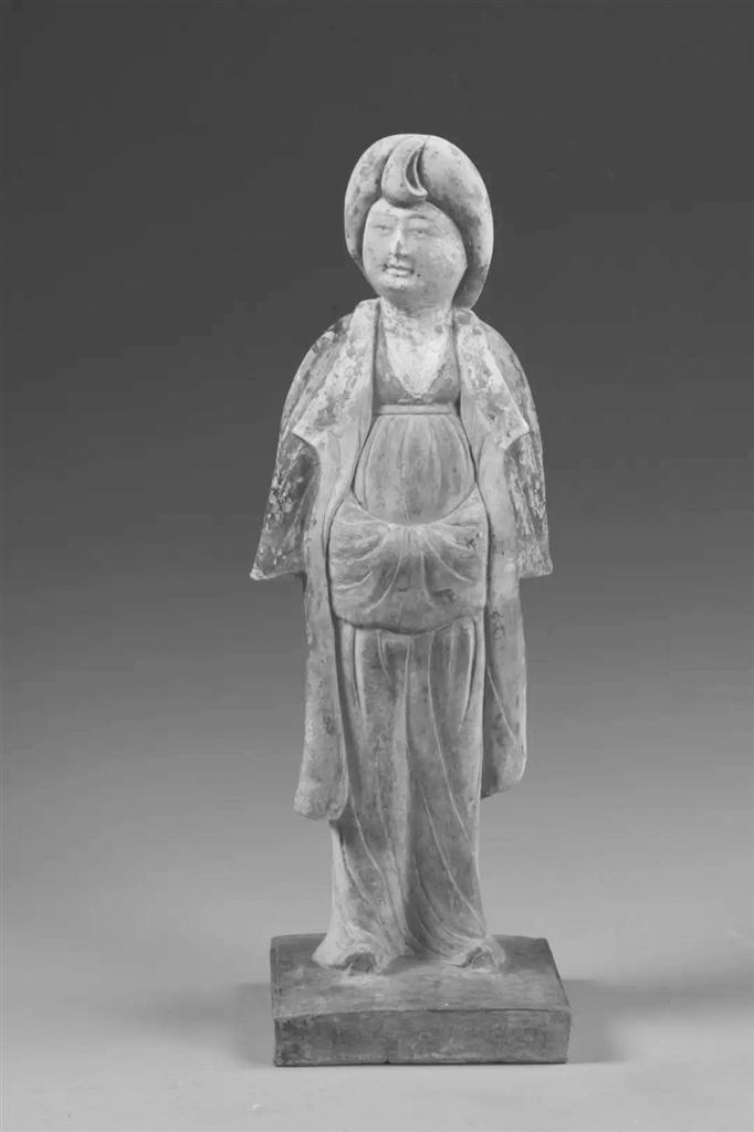 正大氣象,不僅在書法,也滲透到了民眾日常生活中。甘肅慶城博物館收藏有一件彩繪貴婦俑。這是唐開元十八年(730 年)的作品,雙手籠于胸前,站在方形臺座之上,一副唐代貴婦的裝扮。