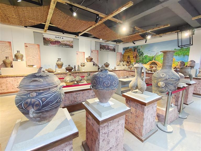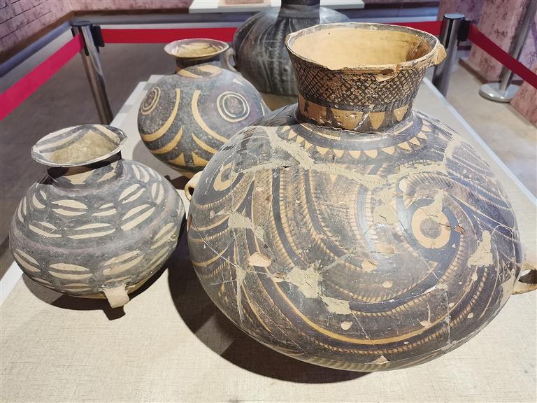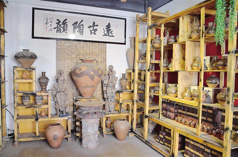 走進彩陶藝術(shù)館,目之所及都是造型獨特的仿彩陶罐,在墻上可以看到陶片裝飾的藝術(shù)品,細節(jié)透著“彩陶之鄉(xiāng)”的文化底蘊。