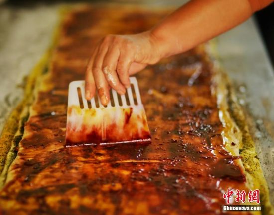 圖為面劑被涂上胡麻油,切成條狀用作月餅的花型制作。張文 攝