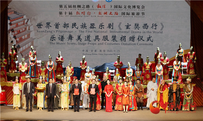 演出結(jié)束后,現(xiàn)場舉行了簡潔而隆重的“大型民族器樂劇《玄奘西行》樂譜舞美道具服裝捐贈儀式”,中央民族樂團將價值360萬元的樂譜、舞美、道具和服裝捐贈給甘肅演藝集團歌舞劇院,并指導甘肅省文藝院團將民族器樂劇《玄奘西行》打造成為弘揚絲路精神、推動絲路文化交流融合的經(jīng)典劇目。中央民族樂團作為海內(nèi)外規(guī)模最大、藝術最完備的綜合性國家級民族音樂表演團體,對甘肅文藝事業(yè)和地方樂團創(chuàng)作發(fā)展和人才培養(yǎng)給予大力支持,為甘肅文藝事業(yè)發(fā)展做出了重大貢獻。