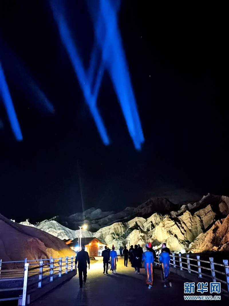 七彩丹霞與燈光秀融合,呈現(xiàn)了一場精彩紛呈的視覺盛宴。新華網(wǎng)發(fā)(王生元 攝)