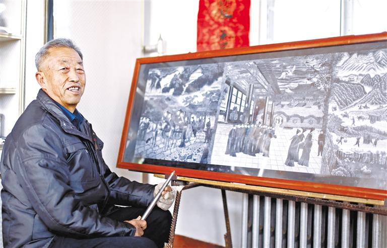 接下來就是耗費(fèi)工時(shí)與體力的制作過程,“每天創(chuàng)作雕刻都在三四個(gè)小時(shí),每分鐘在刻板的敲擊次數(shù)達(dá)到近200次,每小時(shí)敲擊次數(shù)達(dá)到8000-12000次,9大板塊在創(chuàng)作過程中就要敲擊近16億次點(diǎn),每個(gè)板塊耗時(shí)10-11個(gè)月,9大板塊共耗時(shí)3000多天。”陶世清細(xì)數(shù)著創(chuàng)作的艱辛。
