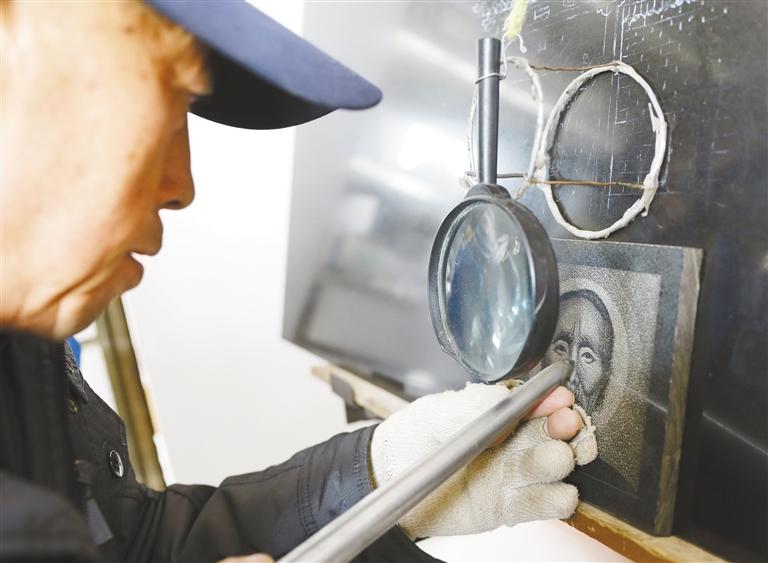 在大理石板上雕刻,是傳統(tǒng)手工技藝影雕的一種。這種雕刻方式采用墨玉、山西黑等純色石材,經(jīng)過水磨拋光后,在磨光面上要把雕琢的圖像輪廓描繪出來,根據(jù)黑白明暗成像原理,用特制的像針一樣細(xì)小的合金鋼頭工具,通過運(yùn)用腕力調(diào)節(jié)針點(diǎn)疏密粗細(xì)、深淺和虛實(shí)線變化而表現(xiàn)圖像。