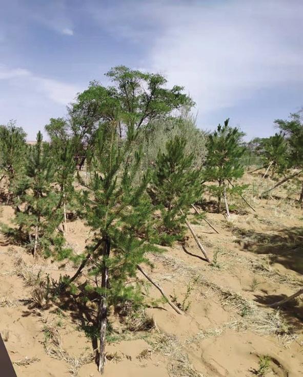 我和同伴撲進(jìn)沙海柔軟的懷抱。認(rèn)識到,再小的沙粒,也不能與塵世隔絕,我與沙,結(jié)緣于此。沙海里,一沙一世界。黃沙大膽赤裸地暴露在天幕蒼芎下,以大,以小,涵納無窮。“沙沙”的足音里,印下我深深淺淺兩行腳印,宣告著浪漫與踏實的存在。我來到習(xí)近平總書記親手栽植的“五棵松”下,仰視青松,綠云葳蕤,生機(jī)勃勃??倳浀年P(guān)懷和鼓勵,黃沙熱熱地、輕輕地長出了更多綠色羽翼,這羽翼在不斷地生長壯大,有“代代相傳”的精神,綠色終究會覆蓋全部騰格里。捧起一捧黃沙,細(xì)沙像嬰兒肌膚般的柔滑,我試圖用臉貼近它,這些黃色的小精靈,從我指縫間輕盈地流淌到松下,似乎在暗示我,要把自己的夢筑進(jìn)治沙精神的瀚海里??茖W(xué)家們已作出結(jié)論:沙漠是人類最后的寶地,別看它現(xiàn)在荒蕪,它里面蘊藏著無盡的寶藏和財富。