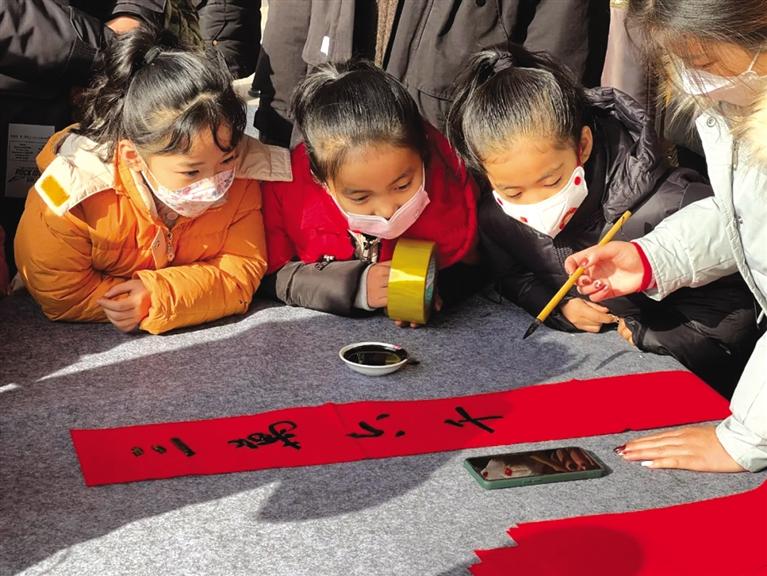 “千門萬(wàn)戶曈曈日,總把新桃換舊符”。書法老師們提筆蘸墨,行云流水,落筆如云煙,寫成了一副副寓意吉祥美好的春聯(lián)。孩子們懷著一顆顆憧憬之心,圍繞在老師們的周圍,幫忙擺放、晾曬春聯(lián)。最后,孩子們將老師寫好的春聯(lián)送給了爸爸媽媽,以及前來(lái)參觀的游客們。