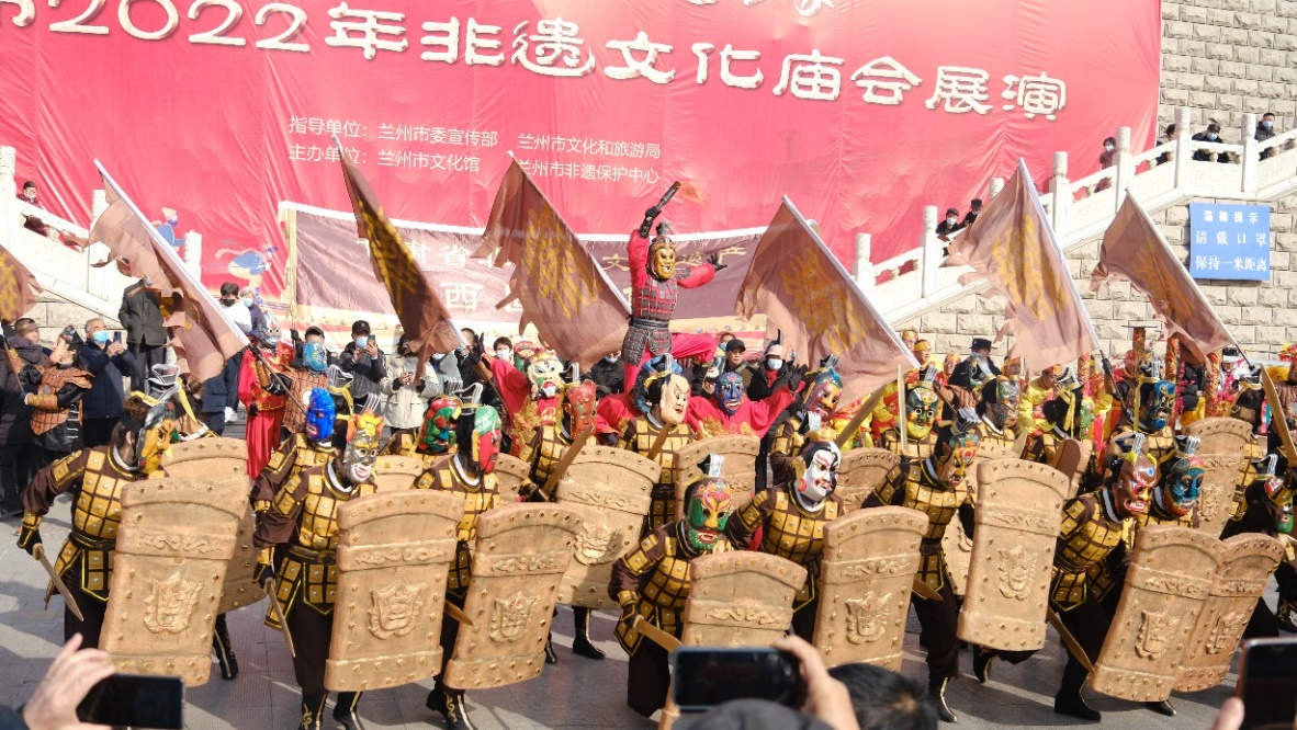 2月2日, 大年初二,“冬奧過大年·文化進萬家”蘭州市2022年非遺文化畝會展演活動在甘肅省蘭州市城關區(qū)金城關舉行。
