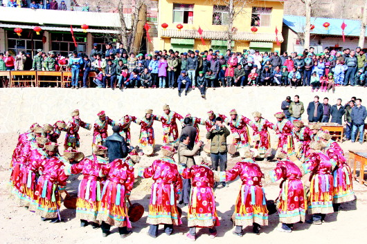 在岷縣,巴當(dāng)舞只在中寨鎮(zhèn)的古莊村、扎那村牙地社和一路村流傳,尤其古莊村最為鼎盛且具規(guī)模。這里毗鄰卓尼縣藏巴哇鎮(zhèn),藏漢兩地僅一公里之遙,情感相連,民心相通。長期以來,群眾在經(jīng)濟(jì)、文化、婚姻等方面交流密切。時至今日,扎那、古莊等村群眾春節(jié)吃肉仍遺留著藏民族彪悍豪爽的風(fēng)格:一大盤“手把肉”端上來,上面插一把小刀,客人可以自削自啖,這種神秘的文化符號似乎無聲訴說著藏漢兩地的過往、發(fā)展和變遷……