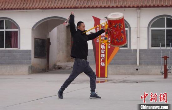 2月中旬,在蘭州市永登縣苦水鎮(zhèn),33歲鄧鑫擊打起太平鼓?!【琶赖┰觥z