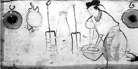 糧食、蔬菜品種與前代相比沒(méi)有大的變化,仍是漢地人的主要經(jīng)濟(jì)和衣食來(lái)源。烹飪方法,這一時(shí)期出現(xiàn)了面粉發(fā)酵技術(shù)。北魏賈思勰介紹發(fā)面技術(shù)說(shuō):“面一石,白米七八升作粥,以白酒六七升酵中,著火上,酒魚(yú)眼沸,絞去滓,以和面,面起可作”(《齊民要術(shù)》卷9)。把北魏時(shí)期的容量數(shù)換算成今天的市斤,上段話的意思就是,用五十多斤面粉,五六斤白米做粥,再用四五斤白酒(甜米酒)做酵母,將酒架火上燒至發(fā)出魚(yú)眼樣的小泡后,濾去酒渣,加入面粥中發(fā)酵,等面發(fā)起后就可以做餅了。這是一項(xiàng)歷史性的烹飪技術(shù)。從發(fā)面的數(shù)量看,一次發(fā)這樣多面的家庭,至少有三五十口人,顯然是當(dāng)時(shí)世家大族的人口規(guī)模。世族如此,普通民眾也應(yīng)很快就學(xué)習(xí)掌握了發(fā)面技術(shù)。