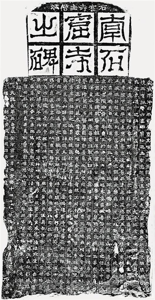 “南石窟寺之碑”原存涇川縣王家溝村南石窟寺。1912年間,當(dāng)?shù)卣畬⑵湟浦每h文廟予以陳列保護(hù),現(xiàn)存涇川縣王母宮石窟寺文管所。碑通高225厘米,寬105厘米,厚17厘米,題額為“符文式”篆書陽刻“南石窟寺之碑”,額上橫列楷書云:“石窟寺主僧斌”。碑文楷書23行,行38字,因碑下部有斷缺,現(xiàn)每行最多存34字。碑文記載了奚康生創(chuàng)建南石窟寺的功德,碑陰有出資修建石窟的施主題名,共3列,計(jì)56人。