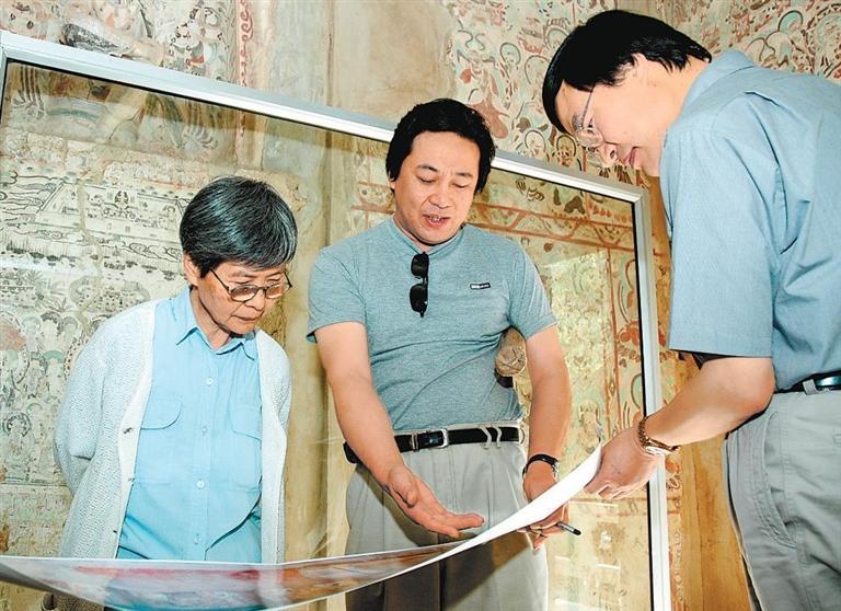 樊錦詩在莫高窟洞窟內指導《敦煌石窟考古全集》的編寫工作。(資料圖)(本文圖片除署名外均由敦煌研究院提供)