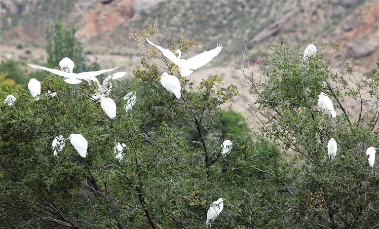 中國(guó)甘肅網(wǎng)10月14日訊 據(jù)蘭州日?qǐng)?bào)報(bào)道 金秋十月,蘭州新區(qū)秦王川國(guó)家濕地公園秋意漸濃。近日,隨著近百只白鷺的光臨,秦王川國(guó)家濕地公園再次迎來(lái)了候鳥遷徙的高峰期,成群的白鷺憩息在樹(shù)枝,繪就了一幅亮麗的秋景圖。
