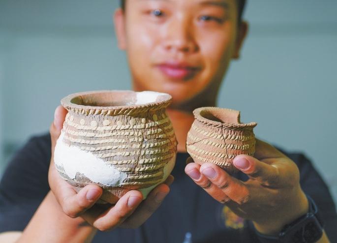 考古工作人員展示南佐新石器時代遺址內出土的箍白泥附加堆紋夾砂陶罐。