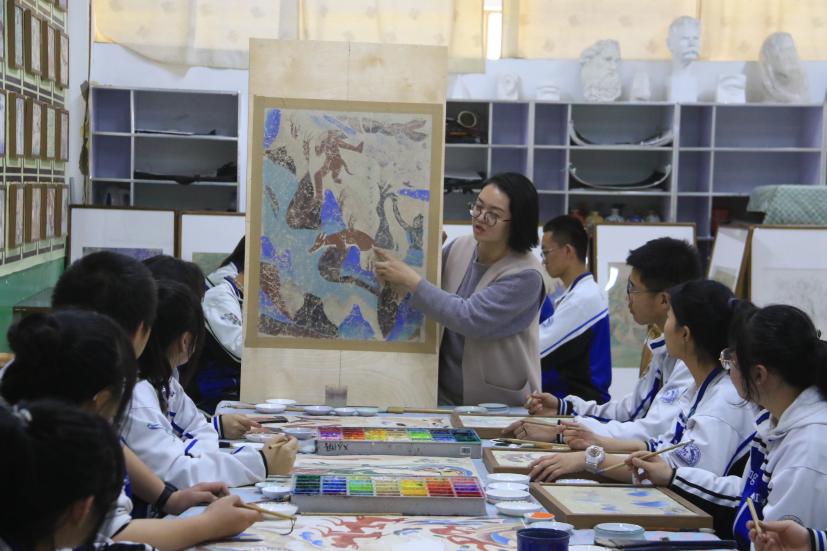 敦煌中學(xué)美術(shù)教師楊娜為學(xué)生講解敦煌壁畫藝術(shù)。張曉亮 攝