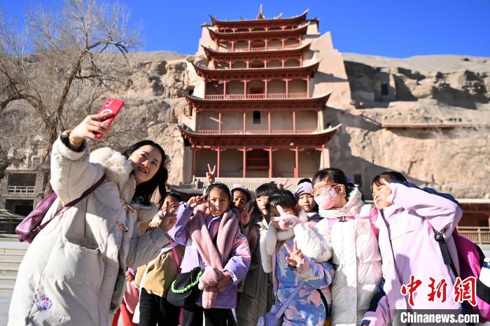 1月11日,來自青海中小學校的師生在敦煌莫高窟標志性建筑九層樓前合影留念。九美旦增 攝