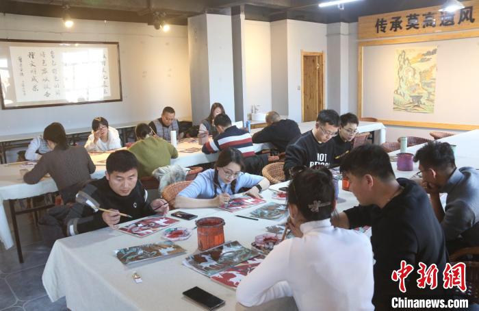 1月11日,來自云南的學員在甘肅敦煌小鎮(zhèn)鳴沙書院研學課堂學習臨摹敦煌壁畫。張曉亮 攝
