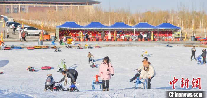 1月7日,游人在敦煌文博冰雪場體驗雪地游玩項目。王斌銀 攝