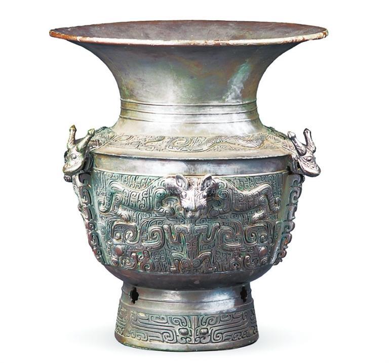 中國國家博物館收藏的龍虎紋青銅尊,高50.5厘米,重26.2千克,為一件體形較高大的盛酒器。青銅尊肩部以圓雕和浮雕相結(jié)合,塑造3條生動(dòng)的蟠龍形象,龍身蜿蜒,龍首探出,額有雙角,闊吻巨口,兩眼大睜。腹部紋飾為一個(gè)虎頭兩個(gè)虎身,虎口之下有一人形,人頭銜于虎口之中?;⑸硐路揭造槔鉃榻?,飾兩夔龍相對組成的獸面。從主體花紋看,龍、虎、人造型莊嚴(yán)穩(wěn)重、奇特神秘,特別是龍頭和虎頭用澆鑄法從外壁突兀凸起,雄健粗獷,比起用高浮雕法更具有一種威武逼人的悍氣。龍虎尊圓形大口表示上天,肩部神龍游蕩于空中;猛虎張牙舞爪守護(hù)大地。龍虎尊的鑄造采用十八塊母范經(jīng)兩次焊接而成,渾然一體,毫無痕跡。整器工藝精湛,花紋線條洗練,是商代青銅器中的精品。