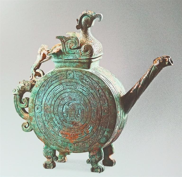 陜西寶雞出土的逨盉,酷似現(xiàn)代的扁圓形壺,器身呈扁圓形,長方形口上有鳳鳥形蓋。鳳鳥引首高昂,喙微卷曲,振翼欲飛。器身與蓋用虎形鏈及雙環(huán)相連,虎作向上爬行狀,頭左偏而尾上卷。直管狀流,流端作龍首狀。鋬呈龍首向下噴水狀,下有四獸足。腹部兩側(cè)紋飾相同,分別由三圈組成,由外向內(nèi)依次為變體夔龍紋、重環(huán)紋和蟠龍紋。逨盉是祭祀禮器,它將天上飛的鳳鳥、地上跑的猛虎、水里游的蛟龍,作為溝通天地、人神的使者,使天地人三者合而為一。由于周人將動(dòng)物視為具有無限神力之神靈,因此青銅器上之動(dòng)物紋樣,除宗教祭祀意涵外,也富有一定的政治意義。貴族通過青銅器上神秘肅穆的動(dòng)物紋樣,令人望之崇敬生畏,以威嚇被統(tǒng)治者,達(dá)到鞏固本身地位及權(quán)威之目的,同時(shí)也含有龍騰虎躍鳳呈祥的美好寓意。