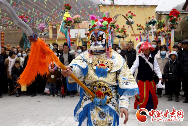2024年2月19日,甘肅省隴南市武都區(qū)魚龍鎮(zhèn)柏家溝村,村民在表演當(dāng)?shù)靥厣珓》N、國(guó)家級(jí)非物質(zhì)文化遺產(chǎn)——高山戲。