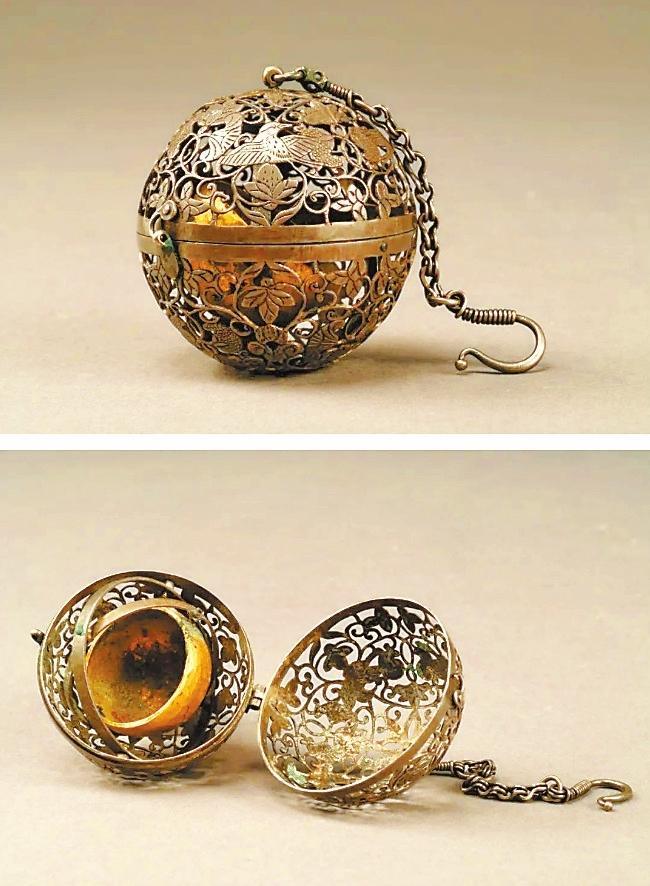 香囊最出彩的地方是機(jī)環(huán)常平架技術(shù),是一種利用球體內(nèi)兩個(gè)同心機(jī)環(huán)與中央焚香盂之間的重力作用,使其在自由轉(zhuǎn)動(dòng)的時(shí)候,始終能保持平衡的機(jī)械原理。唐代的香囊豐富多樣,這種金屬造型的香囊設(shè)計(jì)更為機(jī)巧精致,深受妃后、貴婦們所推崇喜愛,它上承漢代的常平架技術(shù),下延現(xiàn)代陀螺儀萬向支架技術(shù),是中國(guó)古代科學(xué)技術(shù)與手工藝技術(shù)對(duì)世界的杰出貢獻(xiàn)。
