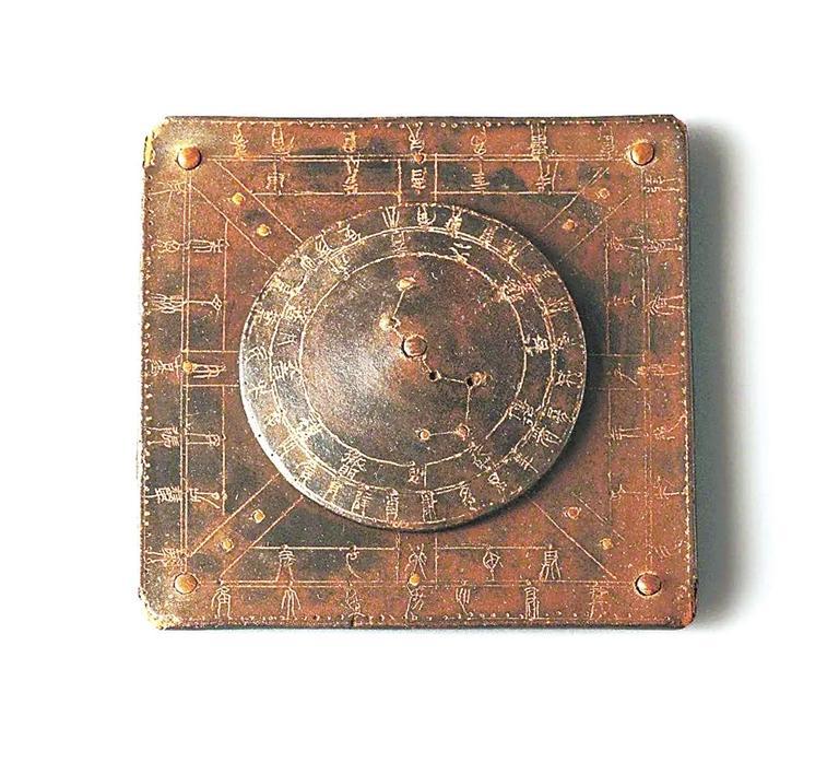 1972年武威市磨嘴子漢墓出土的這件漆栻盤,直徑6厘米,厚1厘米,地盤邊長(zhǎng)9厘米,木胎,髹深褐色漆。由圓形的天盤和方形的地盤構(gòu)制而成,天盤位于地盤之上,正中心以竹軸貫聯(lián),使天盤可以轉(zhuǎn)動(dòng)。天盤中陰刻兩個(gè)同心圓,將其分為三區(qū):內(nèi)區(qū)以竹珠鑲嵌北斗七星,星間刻線相連,斗柄中節(jié)穿過圓心。中區(qū)內(nèi)隸書陰刻十二月神,外區(qū)陰刻篆書二十八宿名。地盤以兩個(gè)相套的正方形分為三區(qū):內(nèi)區(qū)納天盤,中區(qū)陰刻篆書十天干中的八干(不刻戊己)和十二地支名,外區(qū)陰刻篆書二十八宿名。