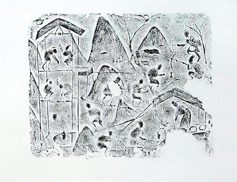 巴蜀地區(qū)是中國(guó)乃至世界鹽業(yè)最早的起源地之一,史載戰(zhàn)國(guó)時(shí)期巴蜀就已開鑿鹽井、汲鹵煮鹽。秦在此設(shè)鹽官,至漢代,四川地區(qū)的井鹽制作已經(jīng)具有一定的規(guī)模,分工細(xì)致,工具完備。此畫像磚表現(xiàn)了漢代制鹽的情景:畫面左下角有高聳的井架,架上安置有轆轤,用以轉(zhuǎn)動(dòng)系在繩索上的吊桶,交替吸鹵,高架旁有一鹵槽,將鹵引入煮鹽的釜內(nèi),釜下架設(shè)有灶,有人正奮力用扇燒起熊熊烈火。