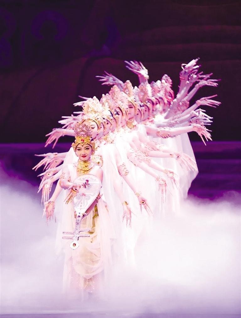 經(jīng)典舞劇《絲路花雨》歷經(jīng)45載,累計演出3952場,觀眾達537.47余萬人次,享有“中國民族舞劇的典范”“東方的《天鵝湖》”之稱。演出現(xiàn)場,劇中經(jīng)典舞蹈選段《金光千佛》《反彈琵琶》《霓裳羽衣舞》《夢幻伎樂天》為游客粉絲和廣大觀眾繽紛綻放,引發(fā)陣陣歡呼。“反彈琵琶”源自莫高窟第112窟的反彈琵琶樂舞圖,“千手觀音”還原了莫高窟元代3窟中的千手千眼觀音圖,“活著的敦煌壁畫”、獨創(chuàng)的“S”形舞姿讓游客沉浸式感受絲路文化藝術(shù)的魅力。