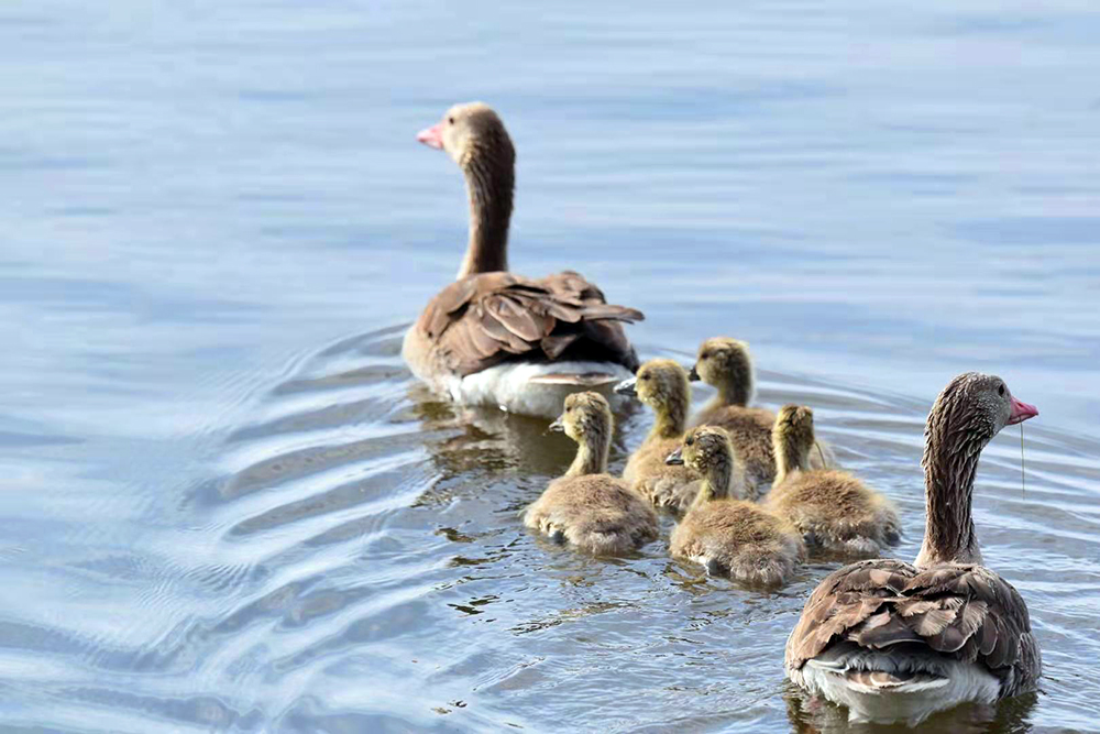 灰雁是鴨科雁屬鳥類,屬國家重點(diǎn)保護(hù)的“三有”鳥類,也是陽關(guān)濕地的夏候鳥。監(jiān)測顯示,在陽關(guān)濕地繁殖的灰雁家族有100多只。每年3月下旬遷飛至陽關(guān)濕地,4月中旬筑巢繁殖,5月上旬孵化出雛鳥4至5只?;已銥?ldquo;一夫一妻”制,孵化由雌鳥單獨(dú)承擔(dān),雄鳥在巢附近負(fù)責(zé)警戒。待雛鳥破殼出窩后,則由雌雄共同撫育?;已闵阅懶?、機(jī)警,小寶寶溜達(dá)時(shí),雌鳥在前開道,雄鳥負(fù)責(zé)斷后,小寶寶上岸覓食嫩草芽時(shí),雄鳥仍然負(fù)責(zé)警戒,若有危險(xiǎn)立刻鳴叫警示。故而,近距離拍攝灰雁雛鳥是比較困難的。