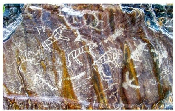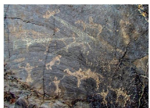 黑山巖畫全稱為“黑山摩崖淺石刻巖畫”,分布于嘉峪關西北約 10—20公里處的黑山峽谷陡崖峭壁上,為遠古時期黑山地區(qū)游牧民族生產(chǎn)、生活的真實記錄。現(xiàn)共發(fā)現(xiàn)分布在黑山石關峽口、磨子溝、蕉蒿溝、四道股形溝、紅柳溝、交河溝六處戰(zhàn)國至明代時期的巖畫,共 157 幅。黑山巖畫反映的時限跨度大,時空關系復雜,涉及部族較多。畫面所反映的內(nèi)容豐富多彩,有動物、人物、佛塔、植物等,還有大型的操練舞蹈場景。涉及人類學、社會學、歷史學、考古學、美術學、生物學、地理學等多個學科,具有較高的研究價值。