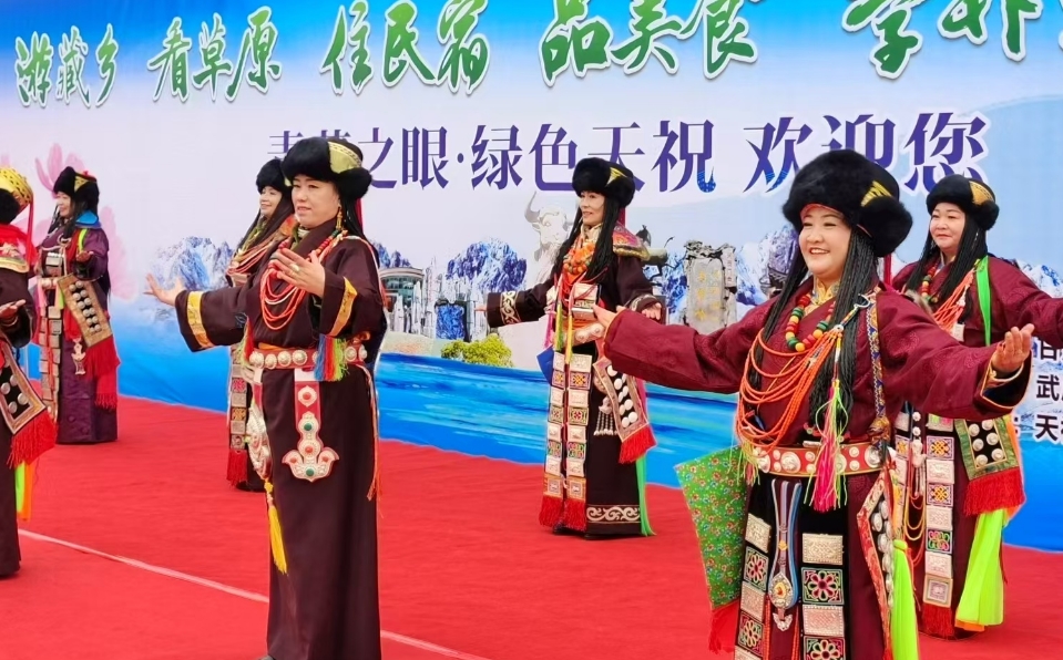 在天祝縣抓喜秀龍阿尼嘎卓帳篷城,身著藏族服飾的美麗卓瑪向采風(fēng)團獻上了潔白的哈達,華銳藏歌、華銳則柔、華銳鍋莊等獨具特色的文藝演出讓現(xiàn)場觀眾拍手稱贊。