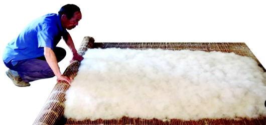 他一邊介紹一邊演示,先用白土揉進(jìn)羊毛,吸掉油氣,再用彈弓加工松軟,并用手拍打鋪放均勻。搟氈前,還要撒面粉,通常中等大小的毛氈摻兩斤多面粉,以增加黏性和柔性。之后還要淋上開(kāi)水,高溫瞬間會(huì)使羊毛變軟。