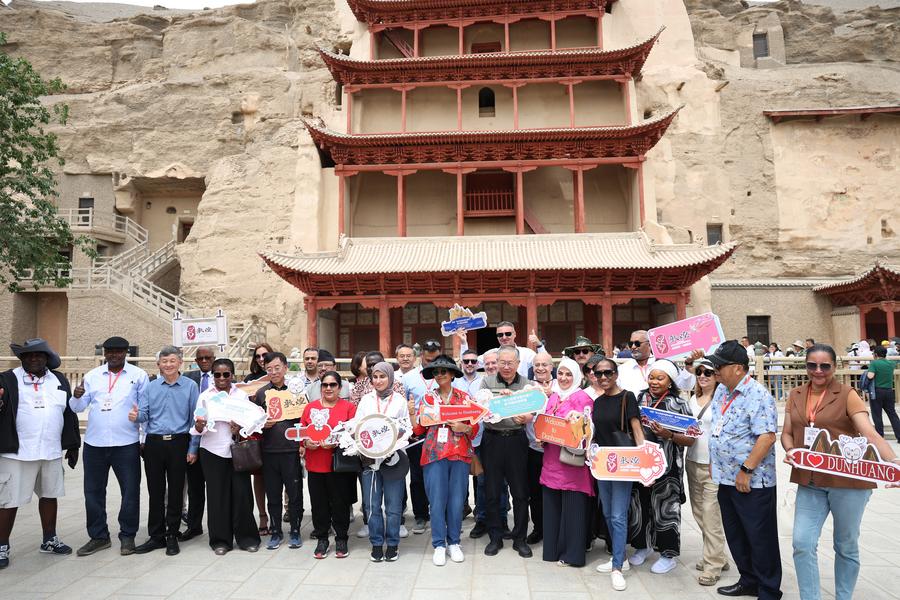 6月6日至8日,來自22個(gè)國家的駐華使節(jié)和高級別外交官走進(jìn)敦煌,尋訪莫高窟,游覽鳴沙山月牙泉景區(qū),參加河西走廊五市的文旅專場推介會,并在對話會上共同探討“絲路精神推動文明交流互鑒”。