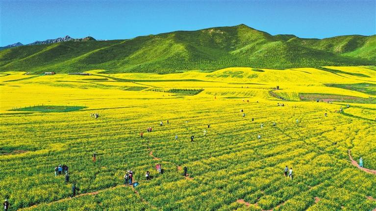一路前行,一路風(fēng)景。一片片的油菜花開得生機(jī)勃勃,連天接地,引得游人駐足拍照。萬(wàn)畝油菜花海隨風(fēng)起伏,如同時(shí)間長(zhǎng)河里濺起的金色浪花,游人穿行于花海中,臉上都露出了孩子般的笑容,愜意而放松……