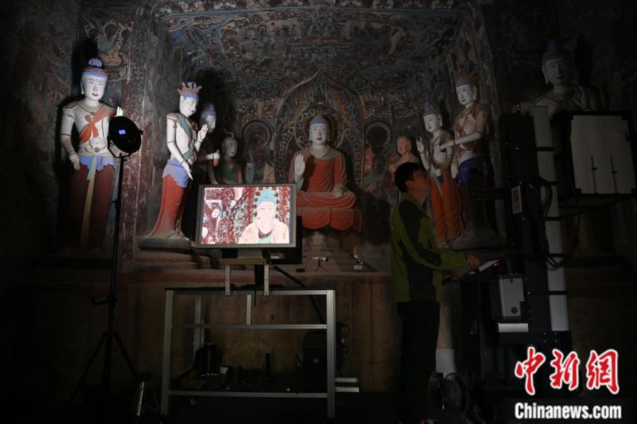 2024年6月,甘肅敦煌莫高窟內(nèi),敦煌研究院文物數(shù)字化研究所工作人員進(jìn)行敦煌壁畫數(shù)字化采集工作。李亞龍 攝