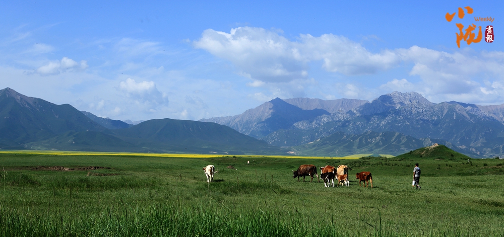 一眼望去,碧綠一片,風(fēng)景秀美。羊群放牧于焉支山下的大草原上,金黃的油菜花、無(wú)邊的草原,氣勢(shì)壯觀。