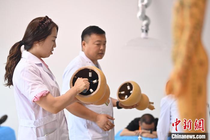 7月16日,甘肅省平?jīng)鍪徐`臺(tái)縣皇甫謐針灸康養(yǎng)館內(nèi),工作人員對(duì)患者進(jìn)行拔火罐。2006年,靈臺(tái)皇甫謐針灸術(shù)入選第一批甘肅省非物質(zhì)文化遺產(chǎn)名錄。靈臺(tái)作為皇甫謐故里,當(dāng)?shù)孛癖姺浅UJ(rèn)可中醫(yī)康養(yǎng),針灸、拔火罐、推拿、葫蘆灸、火龍灸(督脈灸)等中醫(yī)特色療法受到了很多人的青睞,當(dāng)?shù)毓俜揭餐ㄟ^(guò)舉辦大型節(jié)會(huì)等助推中醫(yī)康養(yǎng)產(chǎn)業(yè)發(fā)展。 皇甫謐是針灸醫(yī)學(xué)鼻祖,其《針灸甲乙經(jīng)》已在多個(gè)國(guó)家被廣泛傳播應(yīng)用。  中新社記者 李亞龍 攝
