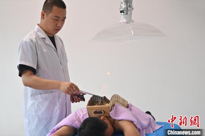 7月16日,甘肅省平?jīng)鍪徐`臺(tái)縣皇甫謐針灸康養(yǎng)館內(nèi),工作人員對(duì)患者進(jìn)行火龍灸治療。2006年,靈臺(tái)皇甫謐針灸術(shù)入選第一批甘肅省非物質(zhì)文化遺產(chǎn)名錄。靈臺(tái)作為皇甫謐故里,當(dāng)?shù)孛癖姺浅UJ(rèn)可中醫(yī)康養(yǎng),針灸、拔火罐、推拿、葫蘆灸、火龍灸(督脈灸)等中醫(yī)特色療法受到了很多人的青睞,當(dāng)?shù)毓俜揭餐ㄟ^(guò)舉辦大型節(jié)會(huì)等助推中醫(yī)康養(yǎng)產(chǎn)業(yè)發(fā)展。 皇甫謐是針灸醫(yī)學(xué)鼻祖,其《針灸甲乙經(jīng)》已在多個(gè)國(guó)家被廣泛傳播應(yīng)用。中新社記者 李亞龍 攝
