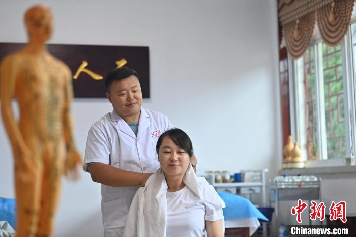 7月16日,甘肅省平?jīng)鍪徐`臺(tái)縣皇甫謐針灸康養(yǎng)館內(nèi),工作人員對(duì)患者進(jìn)行推拿治療。2006年,靈臺(tái)皇甫謐針灸術(shù)入選第一批甘肅省非物質(zhì)文化遺產(chǎn)名錄。靈臺(tái)作為皇甫謐故里,當(dāng)?shù)孛癖姺浅UJ(rèn)可中醫(yī)康養(yǎng),針灸、拔火罐、推拿、葫蘆灸、火龍灸(督脈灸)等中醫(yī)特色療法受到了很多人的青睞,當(dāng)?shù)毓俜揭餐ㄟ^(guò)舉辦大型節(jié)會(huì)等助推中醫(yī)康養(yǎng)產(chǎn)業(yè)發(fā)展。 皇甫謐是針灸醫(yī)學(xué)鼻祖,其《針灸甲乙經(jīng)》已在多個(gè)國(guó)家被廣泛傳播應(yīng)用。  中新社記者 李亞龍 攝
