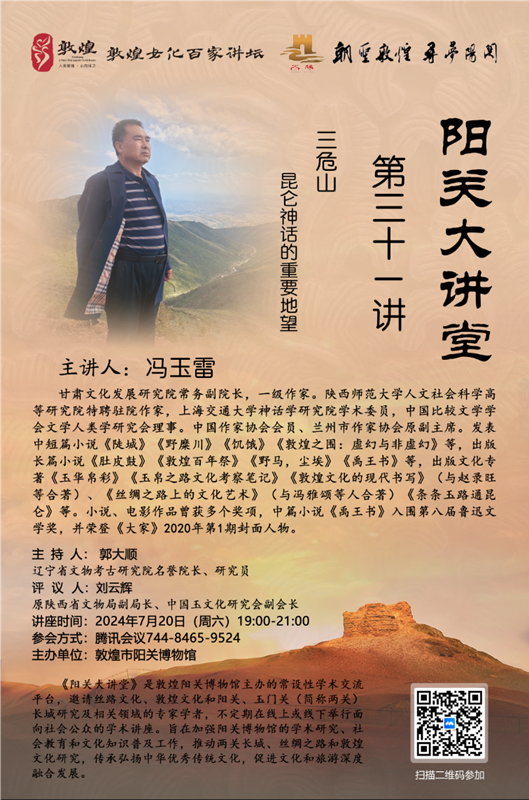 中國甘肅網(wǎng)7月18日訊 7月20日,西北師范大學(xué)甘肅文化發(fā)展研究院常務(wù)副院長、一級作家、玉文化學(xué)者馮玉雷將在線進(jìn)行題為《三危山:昆侖神話的重要地望》的講座。本次講座由敦煌陽關(guān)博物館主辦,為“敦煌文化百家講壇”第31講,遼寧省文物考古研究院名譽院長、資深考古學(xué)家、玉學(xué)家郭大順研究員擔(dān)綱主持,陜西省文物局原副局長、中國玉文化研究會副會長、資深玉學(xué)家劉云輝教授擔(dān)綱評議。