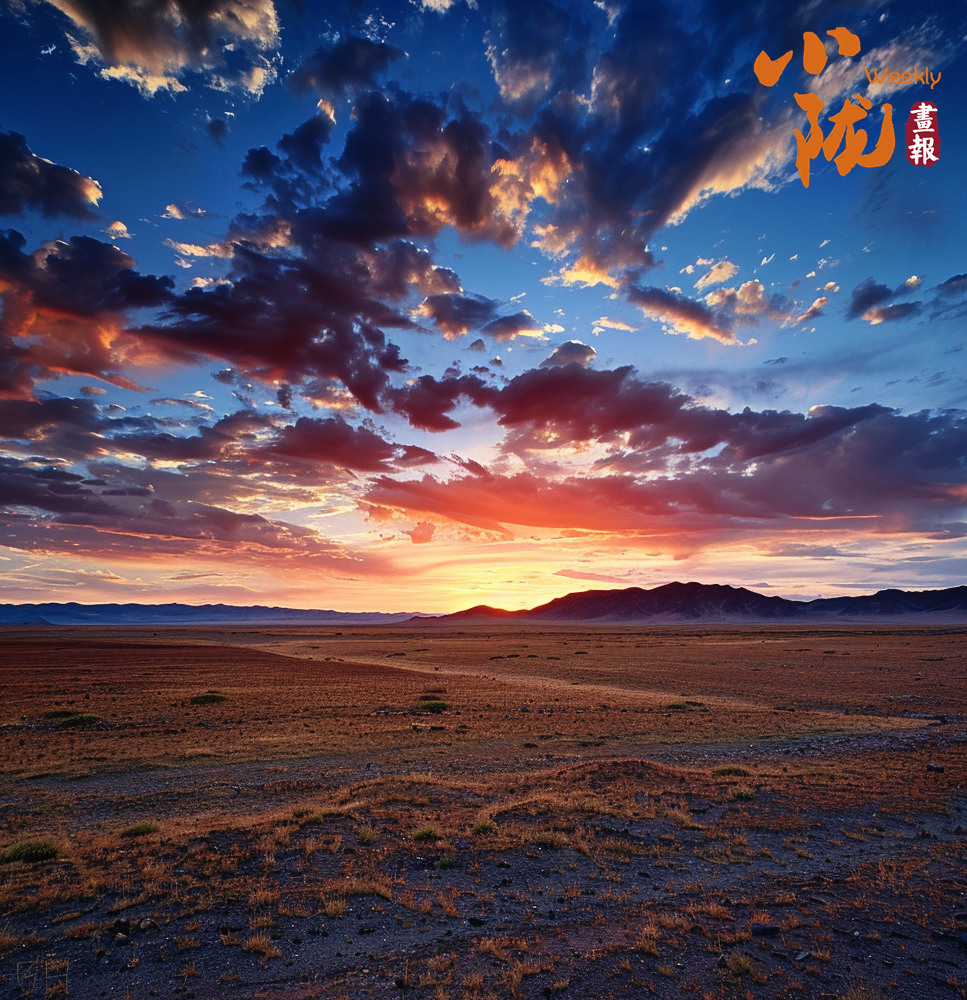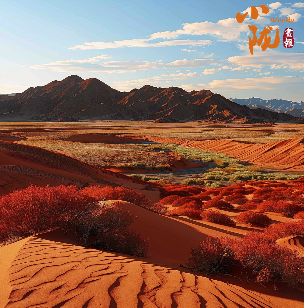 沙漠的沙粒在晚霞的映射下變得金黃而溫暖,仿佛覆蓋了一層光暈。遠(yuǎn)處的山峰也被晚霞點亮,宛如一座座火焰般迎接著夜晚的到來。