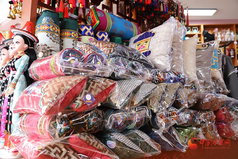 “這個抱枕上的設計非常別致,民族服裝領口和袖口的刺繡也很漂亮,引人注目、創(chuàng)意十足。”幾名挑選民族飾品和工藝品的游客們興高采烈地議論著。