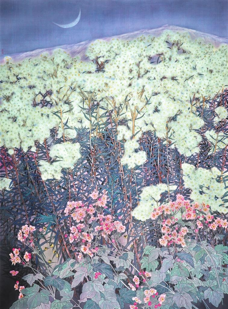 《白露》主要以白色野花香青為主體,野棉花為輔。拉長香青的枝干,以增強畫面的氣勢,繁茂的白花溫馨、浪漫,婀娜的野棉花花朵打破畫面的單調(diào),葉子又構(gòu)成小團塊整體。夜幕下一輪新月,應(yīng)和著紫灰色的畫面主色調(diào),增強了這種美好氛圍。