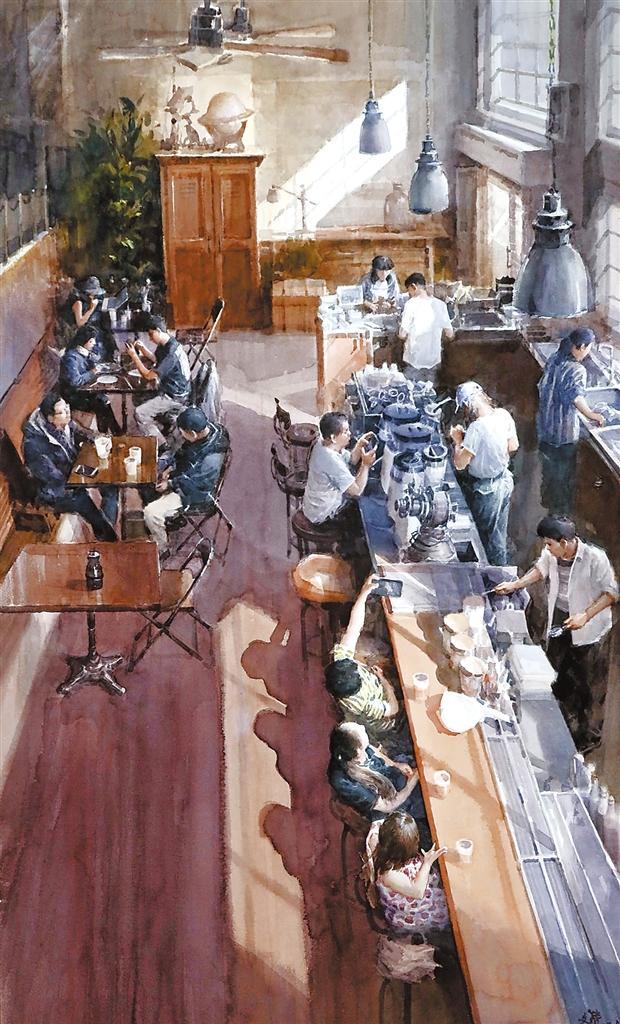 《網(wǎng)紅咖啡館的午后》用寫實方法展現(xiàn)了一個溫馨的生活場景。在構(gòu)圖上,以俯視的角度用大場景來做整體畫面的籌劃,在整體色調(diào)上以沉穩(wěn)厚重的暖色作為基調(diào),把光線穿插、引入到畫面中。在布局上,以陽光照耀下的咖啡館吧臺為主要表現(xiàn)組群,分別刻畫、塑造了工作中的前臺人員、打卡拍照的女性顧客群;把暗部區(qū)域,幾組在咖啡桌邊交談、用餐、喝咖啡的顧客群作為第二層次,展現(xiàn)他們不同的神情和體態(tài);然后完善整體的空間感。在用筆上盡量以松動的筆觸,又能展現(xiàn)細節(jié)的方式來塑造,利用水彩畫需要干、濕、松、緊相結(jié)合,多層次、多遍數(shù)進行渲染的特性,盡可能達到預期效果。 (本版文圖由甘肅省美術(shù)家協(xié)會提供)